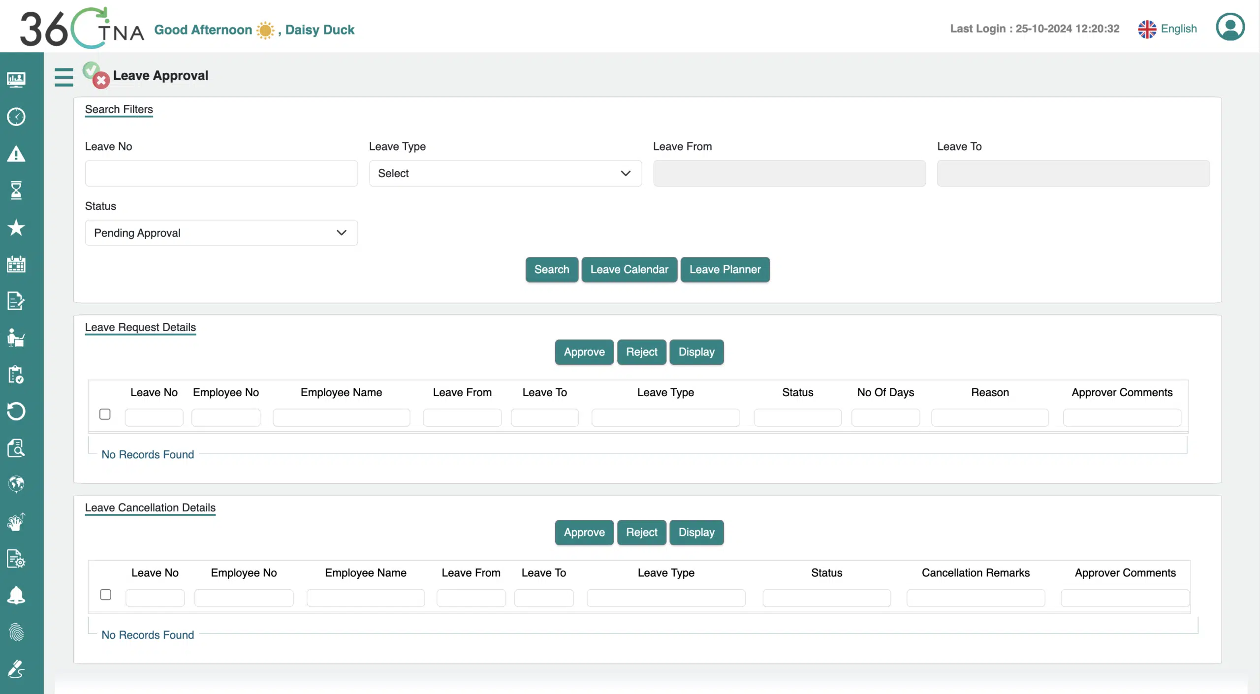 The Leave Request screen provides employees with details about the leave requests made for a selected period. Employees can cancel any requests that are either raised or approved, with both the creation and cancellation processes following the approval hierarchy.